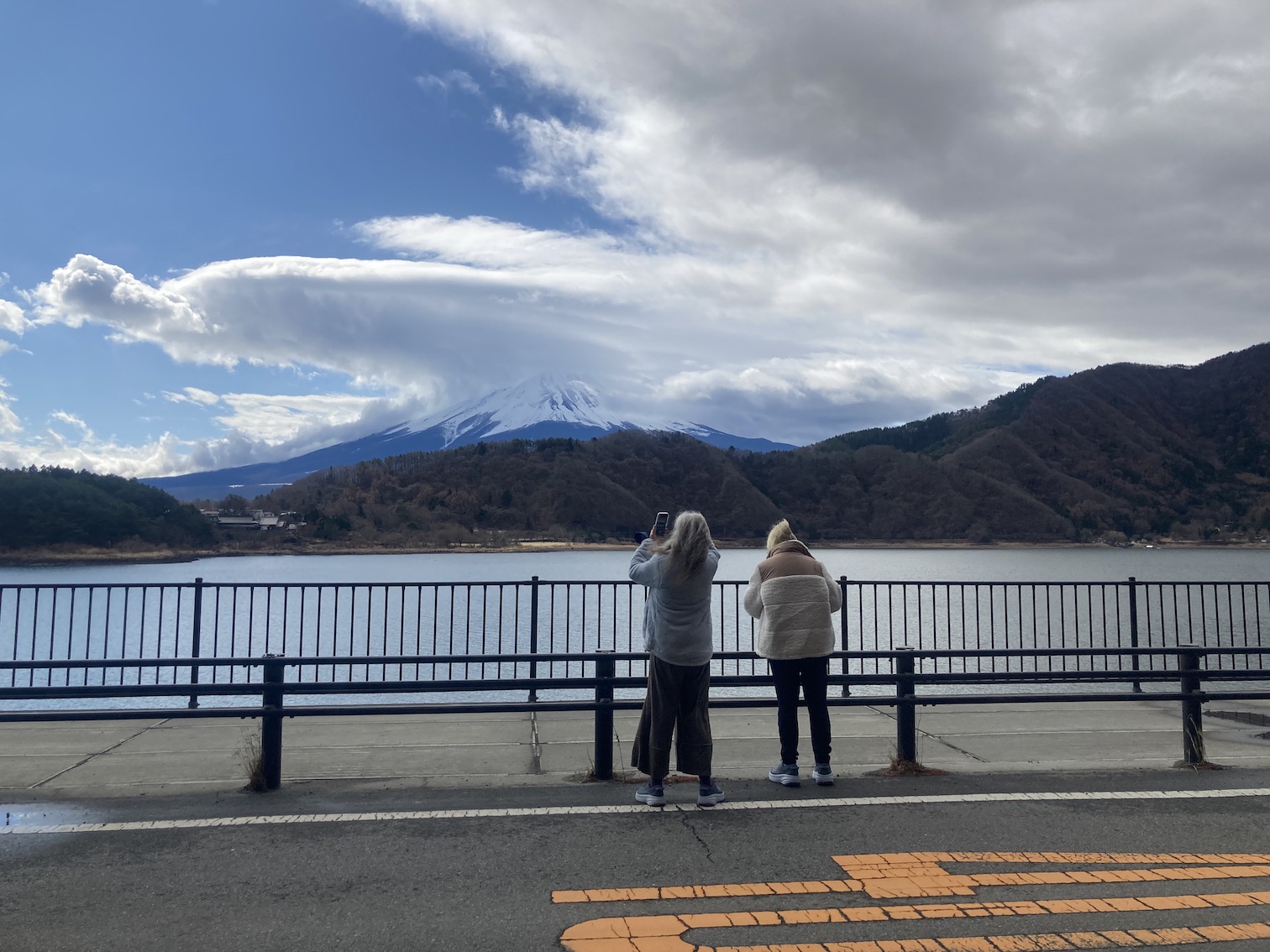 ・半月のスケジュールは、事前にどこに行きたいか、何が見たいか聞いて作っておいた。有名なところやにぎやかな場所には行きたくないということだったので、まずは近くの神社や古民家の里に行き、スーパーでの買い物や、おいしいパイの食べられる店やレストランに出かけた。彼女達は顔を出した富士山に見取れ、河口湖や山中湖、そして西湖の風景に「ビューティフル」を連発した。折から春分の日をはさんだ3連休で、どこも観光客でいっぱいだったから、誰も来ない取っておきの場所にと、青木ケ原の洞窟にも連れて行った。最初の外泊は下部温泉のホテルで、身延の満開の枝垂れ桜や温泉を楽しんだ。トイレにポシェットを忘れ、長湯で湯あたりして鼻血を出したけれど………。